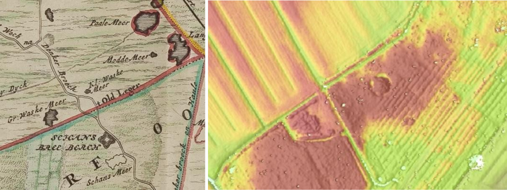 Ofbylding 1: Kaart fan Opsterlân, Schotanus Halma, 1718. Lokaasje fan "t Alde Leger." Boarne: www.rare-atlases.com Ofbylding 2: Ald begraafplak (fjouwerkante foarm) en mooglik stinswier (sirkel) by Heidehuzen by de Poasen. Boarne: AHN Viewer.