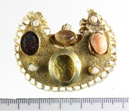Seldsume healmoannefoarmige gouden earring, Mainz-type. Untbrekkende stien ôfbylding fan twa fjochtsjende wolven. Lokaasje: Opsterlân. Datum: 1000 oant 1049. Boarne: www.portable-antiquities.nl